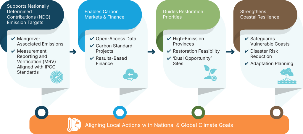 The i-Mangrove Blue Carbon Dashboard links spatial mangrove data with policy, finance, restoration priorities and coastal resilience to align local actions with national and global climate goals.