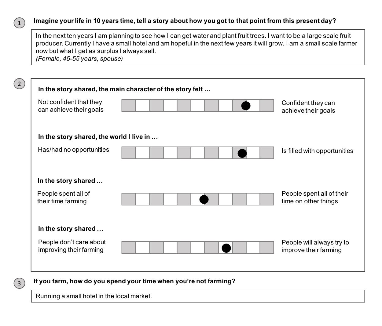 The input of this process was scribed into a document template by Ellie Snowden, and reviewed by the team within two weeks. The instrument was then configured into a SenseMaker® website. (link to site)