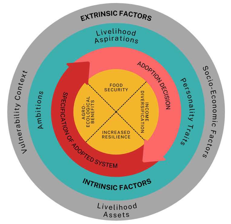 Current food production systems all over the world face numerous challenges. Particularly smallholder farming in sub-Saharan Africa is in substantial need of sustainable solutions. Yet, the adoption of already existing sustainable agricultural practices such as agroforestry often remains low. This paper aims to deepen the understanding of smallholders’ decision-making processes for agroforestry adoption. Using the example of a CIFOR-ICRAF agroforestry project (Fruit Tree Portfolios), we examine the associated influences of ambition and livelihood aspirations on adoption and assess the impact of agroforestry on household well-being. We conduct several statistical analyses, including a logistic regression on the influence of ambitions and aspirations on adoption, and a linear regression with endogenous treatment effects and propensity score matching to assess the impact of adoption on well-being. The analyses are based on a primary data set collected from rural Kenyan households that participated in the project in 2021.