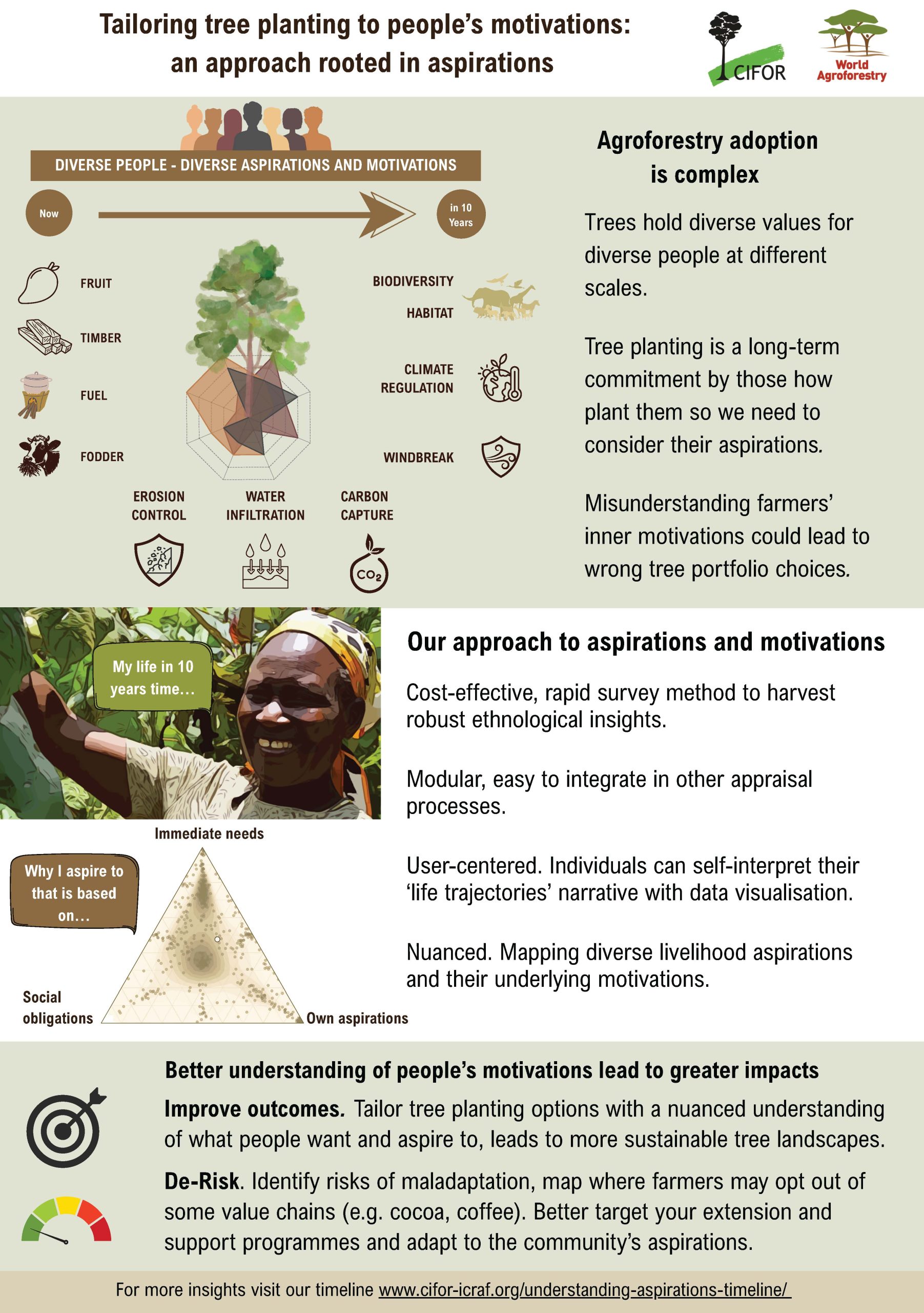 Since early 2021 the aspirations framework has been used under a project that aims to to ensure smallholder families have year-round access to nutritious foods while simultaneously diversifying income generating opportunities. Here we are using an aspirational assessment tool to enable the project to improve the matching of the portfolios to farmers’ needs and future visions. Assessing the connection of aspirations to adoption among participants of a previous portfolio project allows us to take aspirations more directly into account when designing and supporting the adoption of the portfolios in a new context. One of the guiding research questions here is: How can different portfolios of food trees and crops be tailored to suit different smallholder farming systems and farmers’ aspirations?