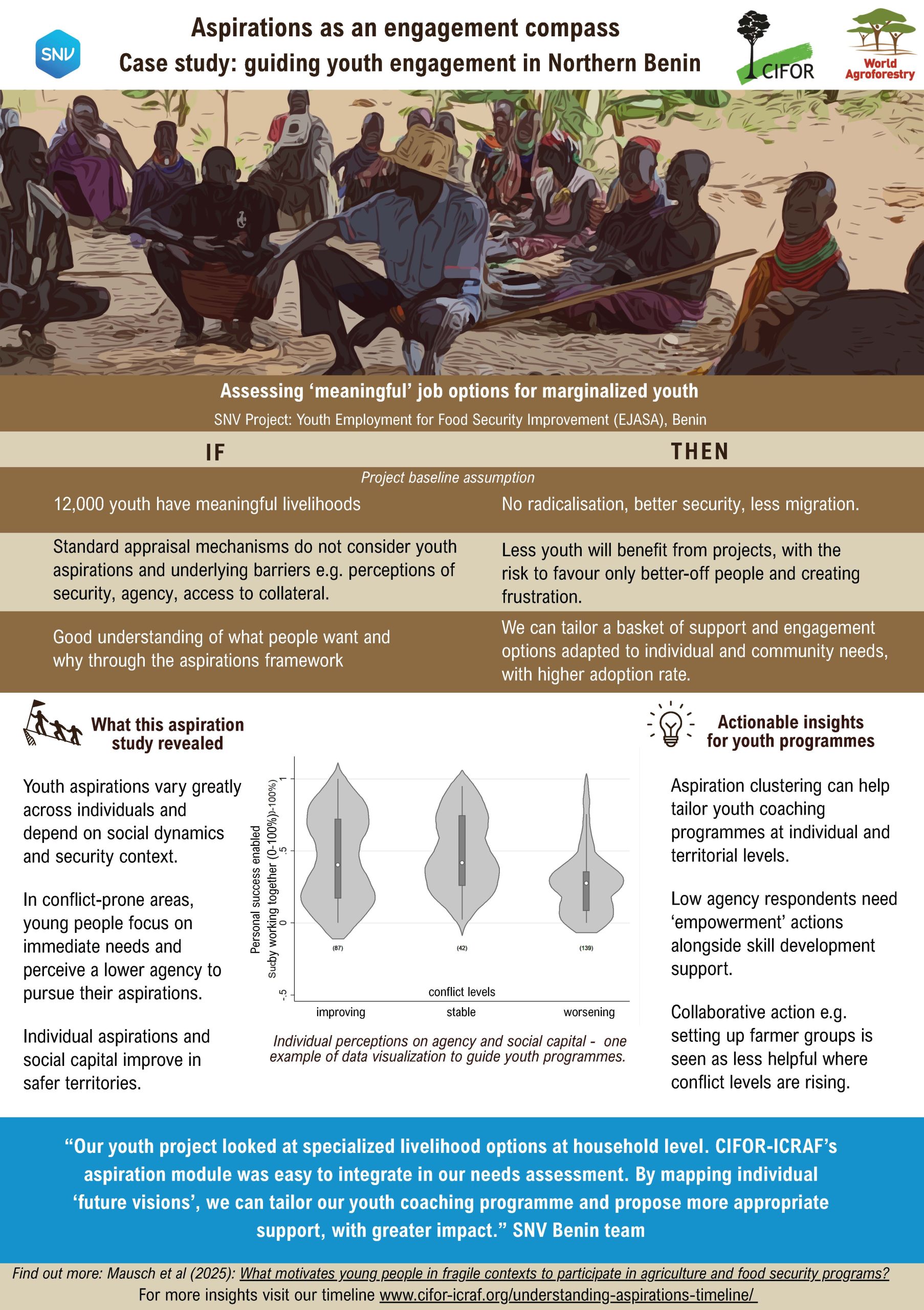 Aspirations of young people in northern Benin reflect the dynamic social, economic, and environmental realities. They are influenced by conflict and instability in this fragile context. Thus, we examine how these aspirations motivate participation in agricultural and food security programs. We randomly sampled 309 young men and women to derive qualitative narratives with quantitative survey data across Matéri, Kandi, and Natitingou communes in northern Benin. In that way, we identified three primary aspiration clusters (immediate needs, prevalent in Matéri, where food security is critical; personal ambitions, dominant in Kandi, focusing on upward mobility and entrepreneurship; and social obligations, reflecting family and community responsibilities). These aspirations are shaped by a combination of all these drivers – basic needs, social pressures, and personal goals – but show a notable trend toward individual aspirations. Conflict exacerbates challenges and perceived opportunities by fostering self-reliance while undermining trust and collaboration. Respondents perceive NGO programs as externally driven rather than participatory. Future research should explore longitudinal changes in aspirations and the impact of tailored interventions and provide insights for actors seeking to align agricultural and food security programs with community needs in fragile contexts.
